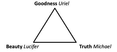 The same relationship with truth, beauty and goodness was part of the mystic experiences of the Christian Theosophist Jacob Boehme (1575-1624). He saw that the Godhead had two kinds of will, love and grudge, a good one and an evil one. Arising from the tension between these emerged the major angels, as a Trinity of the three most important ones, followed by seven angels of manifestation. Of these most important ones, Michael represented Truth, Auriel (or Uriel) represented Goodness, while Lucifer represented Beauty. As the story goes, Lucifer became so absorbed and blinded by his own beauty, that he wanted to be more than the God who had created him, and proceeded to separate himself from the Whole, no longer acting as mediator, and thus took all related energies (angels) with him. These then transformed into an evil force.